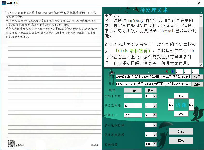 打开软件之后需要进行系列的参数设置,可以先复制粘贴需要处理的文本,然后选择字体、背景,字间距、边距、字体大小、水平笔画位移、竖直笔画位移、笔画旋转等等!设置好之后还可以保存成预设,方便下一次使用。