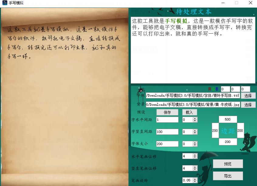 参数设置都可以进行调节,可以点击预览,看参数是否合适,这款软件独家支持调整笔画位移和旋转,能够创造出独一无二的手写笔迹!